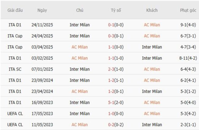 Thành tích đối đầu quá khứ giữa AC Milan vs Inter Milan