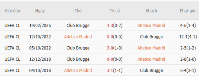 Thành tích đối đầu quá khứ giữa Atletico Madrid vs Club Brugge