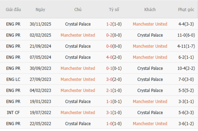 Thành tích đối đầu quá khứ giữa Man United vs Crystal Palace