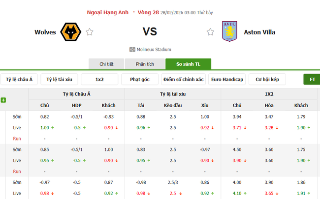 Tỷ lệ kèo Wolves vs Aston Villa