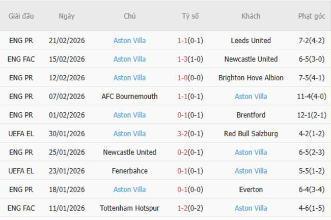 Phong độ của Aston Villa