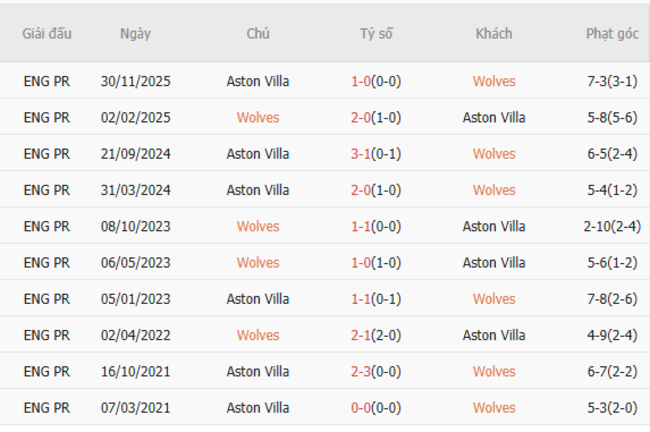 - Kết quả chung cuộc: Wolves 1-0 Aston Villa